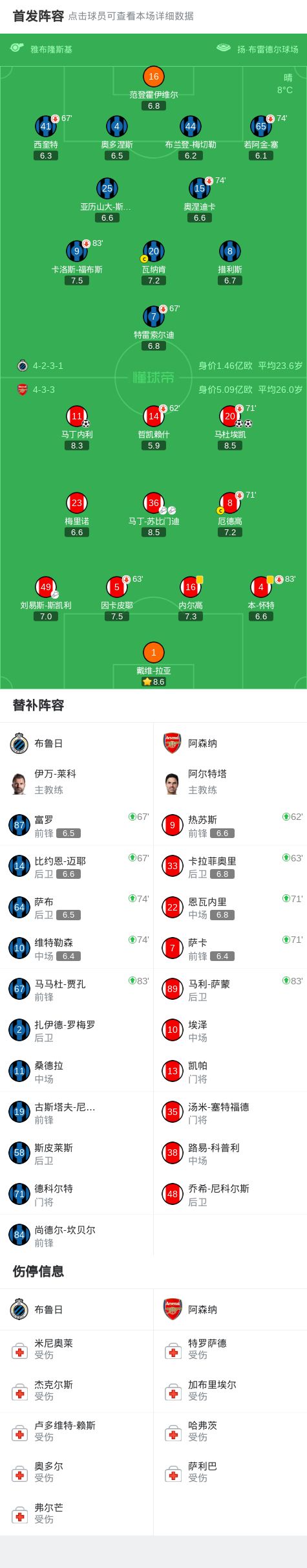 北京时间12月11日4:00,欧冠联赛阶段第6轮,阿森纳作客扬-布雷德尔球场挑战布鲁日,本场主裁判为雅布隆斯基。上半场,马杜埃凯凭借个人能力奔袭轰世界波。下半场,马杜埃凯头球再下一城,马丁内利也轰世界波,最终,阿森纳3-0客胜布鲁日。